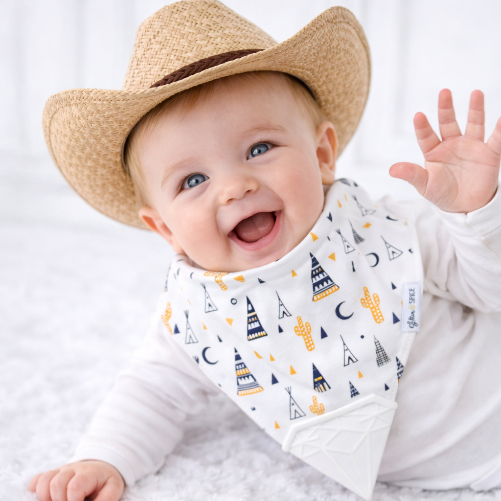 Our stylish Chew Bibs are the perfect accessory for your teething little. With teething comes drooling, so our absorbent bibs will keep your littles dry and stylish, while giving them something to chew on to relieve their sore, teething gums.